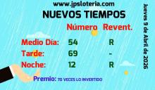 ¿Qué número salió hoy en la noche? El Jueves 9 de Abril de 2026 los ganadores del sorteo de los Nuevos Tiempos han correspondido a los siguientes números , 54 en el sorteo de día,69 en el sorteo de tarde y 12 en el sorteo de noche.