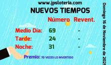 ¿Qué número salió hoy en la noche? El Domingo 16 de Noviembre de 2025 los ganadores del sorteo de los Nuevos Tiempos han correspondido a los siguientes números , 69 en el sorteo de día,24 en el sorteo de tarde y 31 en el sorteo de noche.