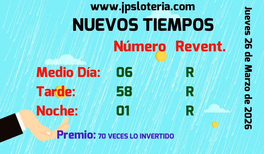 ¿Qué número salió hoy en la noche? Ya tenemos el último sorteo de Nuevos Tiempos de Costa Rica celebrado en el auditorio de la Junta de Protección Social Alfredo Echandi Jiménez. Concretamente el sorteo del Jueves 26 de Marzo de 2026. Puedes usar nuestra página para chequear tus boletos de Nuevos Tiempos del Jueves, ponemos a disposición de los usuarios la información referente al sorteo, los números ganadores de tarde y noche y los premios repartidos. Además, puedes reproducir el vídeo del sorteo en el canal YouTube de la Junta de Protección Social.